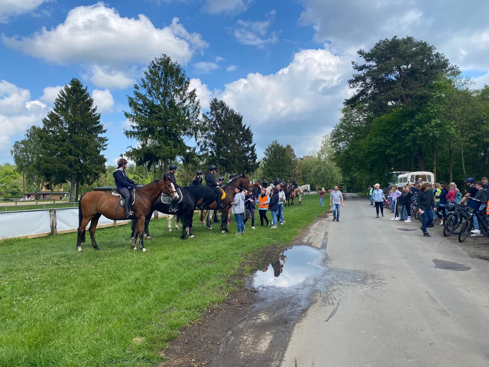 21 Reiterinnen und Reiter sattelten ihre Pferde um einen schönen Ritt bei guten Wetterverhältnissen zu erleben. Begleitet von 15 Planwagenfahrern ging es durch den Latzenbusch über einige Wiesen und die Hees.